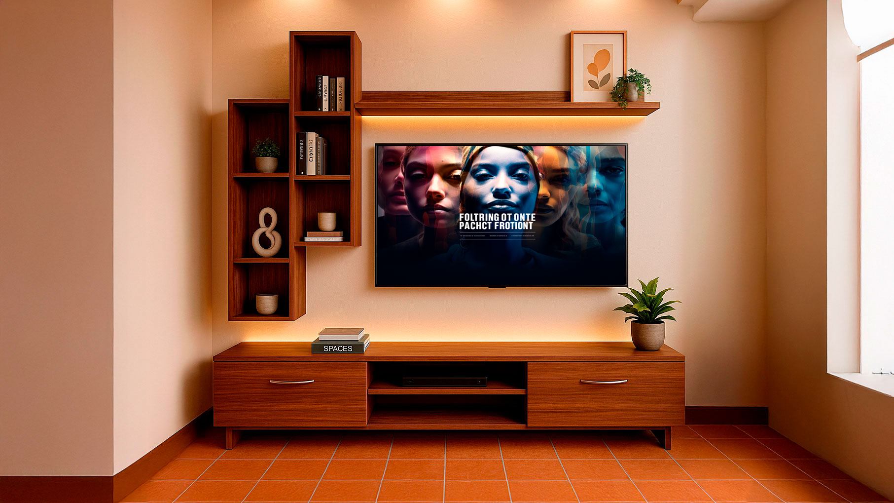 Este centro fue pensado para un espacio cálido y minimalista. El cliente buscaba almacenamiento funcional y un diseño que no recargara la sala. Se propuso una solución flotante con repisas abiertas, iluminación LED y acabado tipo madera natural.